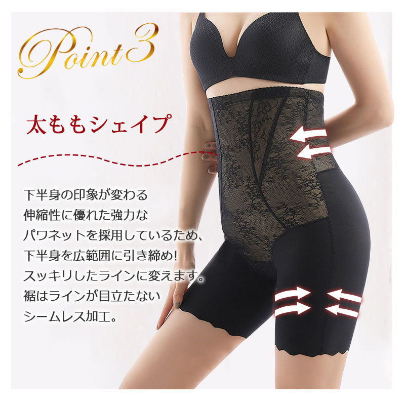 | 【詳細】 | 【お腹のシェイプアップ】脇肉やぼっこり下腹を撃退!ハイウエストタイプなので、ウエストラインを広範囲にカバー。ウエストを細く見せ、くびれを強制的に作るために、おへその上までカバー。特殊縫製で生地の方向から計算されたネット構造で余分なお肉を包み込むようにシェイプします。 【持ち上げてヒップアップ】垂れ下がったお尻肉・セルライトが沢山ついたお尻周りの贅肉をぎゅざゅっと引き締め。お尻下から強力加圧を加えることによりグッと上に持ち上げ美しいヒップライン形成も可能に。 【太ももシェイプ】下半身の印象が変わる伸縮性に優れた強力なパワネットを採用しているため、下半身を広範囲に引き締め!スッキリしたラインに変えます。裾はラインが目立たないシームレス加工。 【骨盤をしっかり引き締め】強圧パワーネットが骨盤を気持ちよく引き締めます。均一の強圧力でしっかりと引き締めます。美しい姿勢を意識的にする事でさらに美しく。 【メディカル温活】下腹部の三角ゾーンが冷えると健康や美容に大きく影響を与えます。このゾーンの「温活」が重要。下腹部を快適に温め、特殊な分圧生地で部分的な締め付けを防ぎ、面で優しく支えます。 【金属製ボーン めくれ防止】一般的なハイウエストガードルは長時間着用していると、ウエスト上部がくるくる丸まってしまい、よりお腹の段差が強調されることに。お腹細見せガードルは、ボーンがウエストの丸まりを防止しますので、いつまでもスッキリラインをキープすることができます。 | |