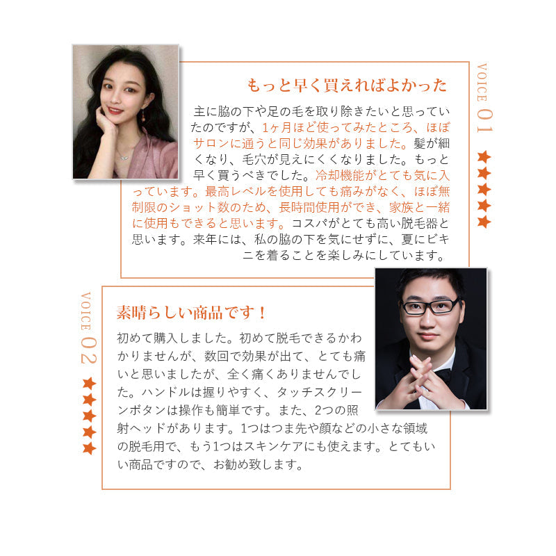 【無痛脱毛】脱毛しながら、肌表面の温度を下げて、何といっても痛み・熱さを非常に感じにくいのでお肌への負担がかからない最新の脱毛器です。不快感や痛伴わない脱毛を実現します。本冷感脱毛器は敏感肌でも安心してご使用いただけます。 【無制限回照射&5段階の出力レベル】 無制限回の照射回数があり、長期間の使用が可能で全身の脱毛に使用ができます。また、肌質や毛質に合わせて、手動照射と自動連続照射モードがあり、最適なケアが楽しめます。 【全身脱毛可能で顔や指などラクラク脱毛可能】 全身各部分(足、脇部、腕、背中、ビキニライン、髭、)に使用可能です。指などの小範囲や関節の部位の使用に最適。ライトヘッドを本体の照射面に置くだけで、自動的に本体に装着が可能です。 【選べる5段階のパワ一】5段階の細かい出力調整、1照射あたり、17.6ジュール顔やVIOなど全身に使える。脱毛サロン以上の照射パワ一。 【ツーモード】手動モード:ボタンを押す毎に照射します。ワキや顔、VIOなど小さい部分のケアに適しています。自動モード:ー定時間毎に自動で照射し ます。腕や足など広い部分のケアに適しています。 |
