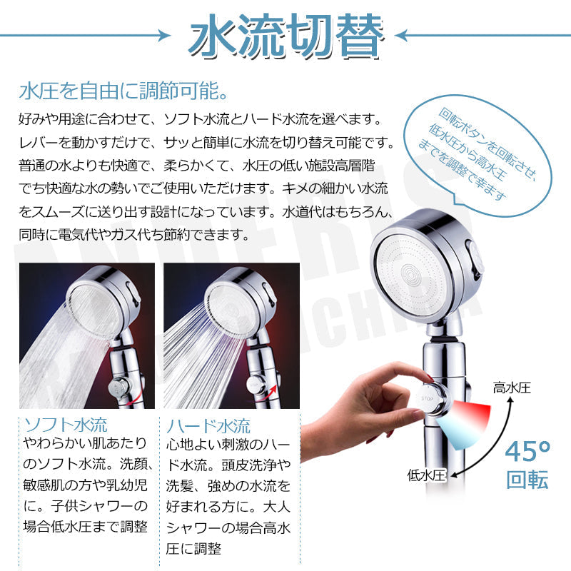 【水流切替】水圧を自由に調節可能。好みや用途に合わせて、ソフト水流とハード水流を選べます。レバーを動かすだけで、サッと簡単に水流を切り替え可能です。普通の水よりも快適で、柔らかくて、水圧の低い施設高層階でち快適な水の勢いでご使用いただけます。キメの細かい水流をスムーズに送り出す設計になっています。水道代はもちろん、同時に電気代やガス代ち節約できます。